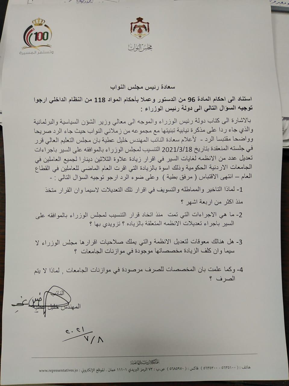 وجه النائب خليل عطية سؤالاً لرئيس الوزراء الدكتور بشر الخصاونة حول أسباب المماطلة والتأخير والتسويف بإقرار علاوة الـ 30 ديناراً للعاملين في الجامعات الأردنية الحكومية أسوة بموظفي القطاع العام.