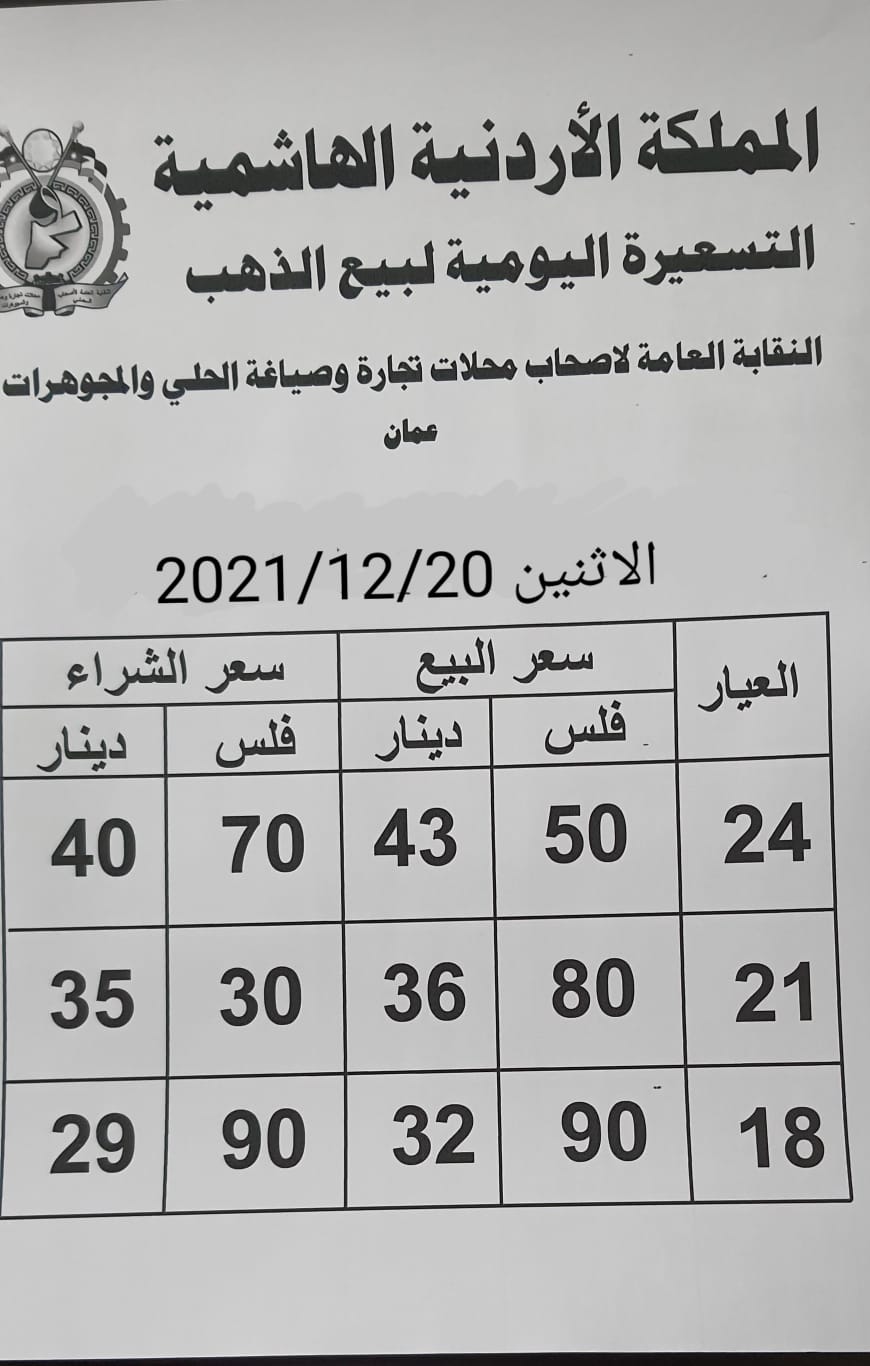 فيما بلغ سعر بيع الغرام من الذهب عياري 24 و 18 لغايات الشراء من محلات الصاغة عند 43.50 و 32.90 دينارا على التوالي.