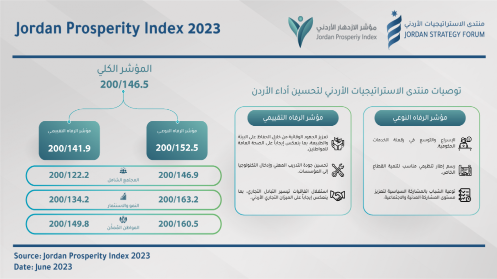 وأصدر المنتدى، تحديثه الرابع من تقرير مؤشر الازدهار الأردني للعام 2023، والذي يقيس مستوى الرفاه في الأردن باستخدام مجموعة واسعة من المؤشرات الفرعية المحلية، وأيضاً بالاسترشاد بمؤشر ليغاتوم للازدهار العالمي – باعتباره أحد المستهدفات الرئيسية ضمن رؤية التحديث الاقتصادي والمتمثل في رفع أداء الأردن ليصبح ضمن أداء أعلى 30% من البلدان في المؤشر.