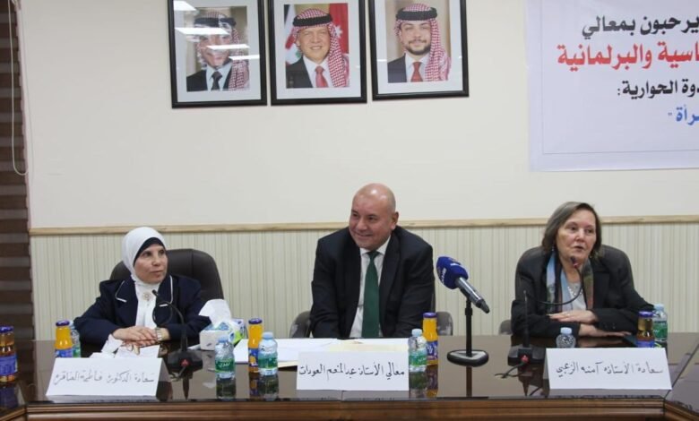 وتخللت الندوة الحوارية جلستان نقاشيتان شارك بها؛ امين عام وزارة الشؤون السياسية والبرلمانية الدكتور علي الخوالدة، وعضو مجلس مفوضي الهيئة المستقلة للانتخاب الدكتور عبير دبابنة، وعضو مجلس الاعيان الأسبق فداء الحمود، ورئيس اللجنة القانونية بمجلس النواب مصطفى العماوي، وعدد من ابناء المجتمع المحلي والاكاديمي والتربوي.