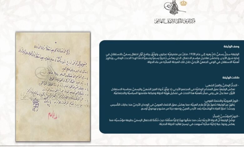 في مناسبة الذكرى 79 لاستقلال المملكة الأردنية الهاشمية، عرض مركز التوثيق الملكي الأردني الهاشمي وثيقة تاريخية نادرة تعود إلى عام 1928، تكشف لأول مرة عن تفاصيل أول احتفال رسمي بالاستقلال في إمارة شرق الأردن، الذي نظمته متصرفية عجلون آنذاك.