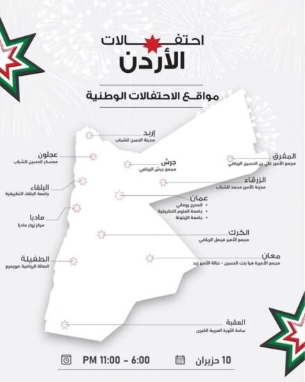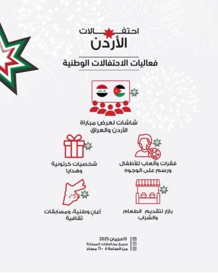 وأضافت الوزارة أن احتفالات وطنية شعبية ستُقام، وذلك بمناسبة عيد الجلوس الملكي، ويوم الجيش، وذكرى الثورة العربية الكبرى، حيث تنطلق الفعاليات ابتداءً من الساعة السادسة مساءً، في جميع محافظات المملكة.