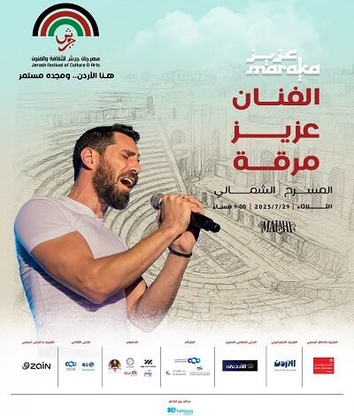 يستعد الفنان الأردني المحبوب عزيز مرقة لإحياء ليلة فنية متميزة ضمن فعاليات مهرجان جرش للثقافة والفنون 2025 في دورته التاسعة والثلاثين، وذلك على المسرح الشمالي يوم الثلاثاء الموافق 29 يوليو/تموز في تمام الساعة التاسعة مساءً.