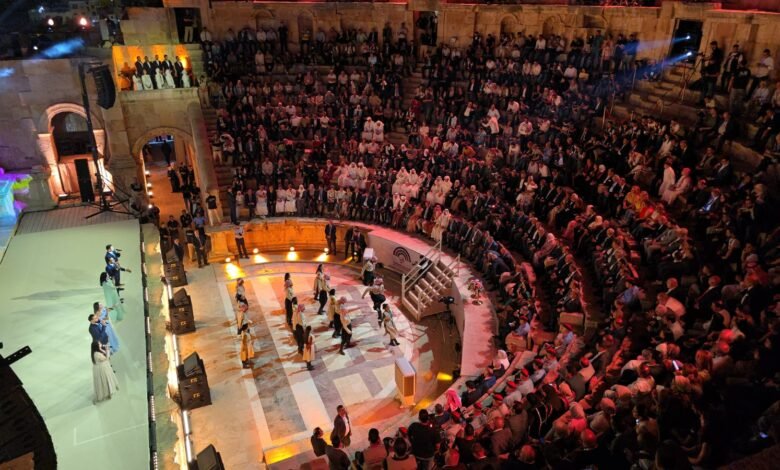 جلالة الملك عبد الله الثاني،ولي العهد الأمير الحسين بن عبد الله الثاني،العلم الأردني،شعار المهرجان: هنا الأردن، ومجده مستمر،ومعالم من المدينة الأثرية العريقة في عرض جمع بين الإبهار البصري والدلالة الرمزية، جاء بحضور دولة رئيس الوزراء الدكتور جعفر حسان، ومعالي وزير الثقافة مصطفى الرواشدة، إلى جانب حشد من الضيوف العرب والأجانب، ليكون لحظة خالدة في ذاكرة المهرجان.