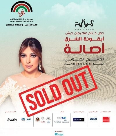 نفدت تذاكر حفل الفنانة أصالة نصري ضمن فعاليات مهرجان جرش للثقافة والفنون في دورته الـ39، وذلك منذ يوم أمس الخميس، قبل يومين من موعد الحفل المقرر يوم غد السبت 2 آب 2025، في ختام المهرجان وعلى المسرح الجنوبي.