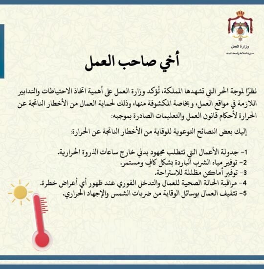 وقال الناطق الإعلامي للوزارة محمد الزيود إن توجيهات الوزير جاءت لحث أصحاب العمل على وضع خطط استباقية وبيان جاهزيتهم للتعامل مع الحالات الطارئة في هذه الأحوال الجوية واتخاذ الاحتياطات والتدابير اللازمة لحماية العاملين لديهم من الاخطار الناجمة عن الاجهاد الحراري وذلك بما يتماشى مع قانون العمل والأنظمة والتعليمات والقرارات الصادرة بموجبه.