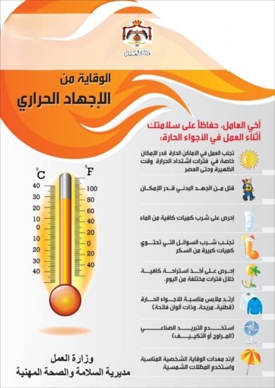 ودعا أصحاب العمل إلى جدولة الأعمال التي تتطلب مجهود بدني خارج ساعات الذروة الحرارية، توفير مياه الشرب الباردة بشكل كافٍ ومستمر، توفير أماكن مظللة للاستراحة، مراقبة الحالة الصحية للعمال والتدخل الفوري عند ظهور أي أعراض خطرة وتثقيف العمال بوسائل الوقاية من ضربات الشمس والإجهاد الحراري.