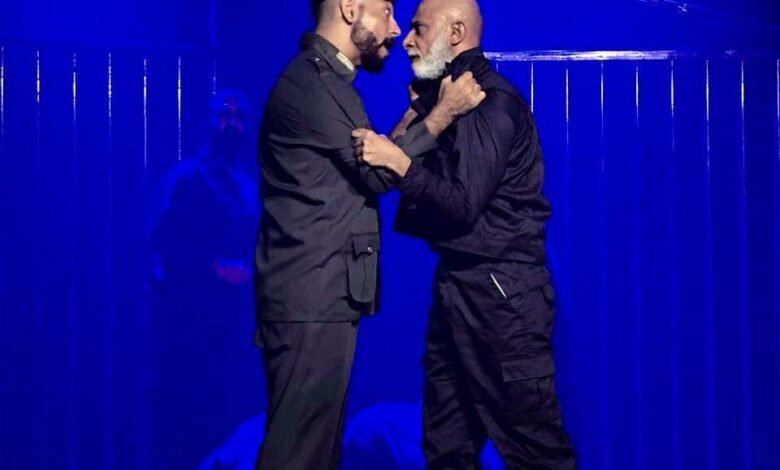 على خشبة تتوزع فوقها القضبان الحديدية، يبدأ العرض بصورة قاسية، سجين عجوز، هو “الحوت”، يقع تحت ضربات سجان لا يرحم، فيما يحرك السجناء القضبان ليعيدوا تشكيلها كسجن متحول يكاد يبتلع جسده، تلك الافتتاحية لم تكن مجرد مشهد جسدي، بل بيان بصري يكشف أن السجن ليس مكانا ثابتا، بل حالة متغيرة تلاحق الجسد والروح.