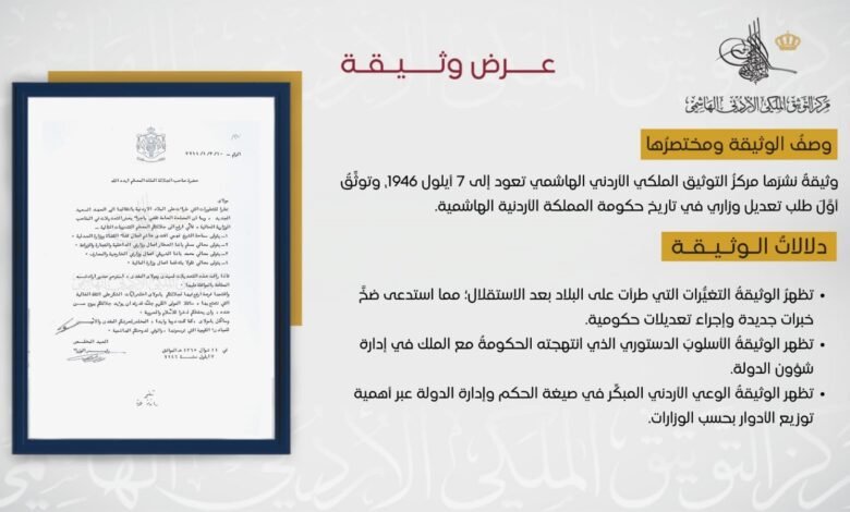 عرض مركز التوثيق الملكي الأردني الهاشمي، وثيقة تاريخية تعود إلى 7 أيلول 1946، توثق أول طلب تعديل وزاري في حكومة المملكة الأردنية برئاسة إبراهيم هاشم، وذلك بعد أشهر قليلة من إعلان الاستقلال.