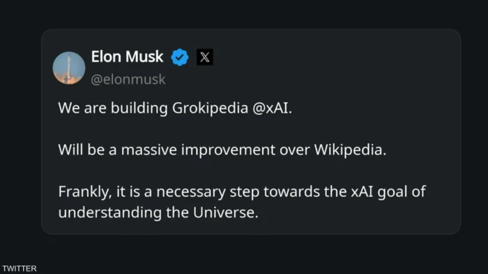 وقال ماسك الذي يمتلك منصة التواصل الاجتماعي “إكس” إن الخدمة الجديدة سوف تكون “تحسنا هائلا” عن الموسوعة الإلكترونية القائمة منذ فترة طويلة على مساعدات من المتطوعين في إدخال المعلومات وتحريرها.