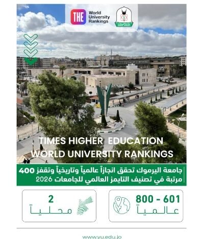 جامعة اليرموك تحقق إنجازاً عالمياً وتاريخياً وتقفز ٤٠٠ مرتبة في تصنيف التايمز العالمي للجامعات ٢٠٢٦