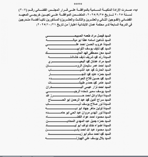 صدرت في الجريدة الرسمية، اليوم الخميس، إرادة ملكية سامية بالموافقة على تعيين عدد من القضاة من خريجي المعهد القضائي من الفوجين الثاني والعشرين والثالث والعشرين، قضاة متدرجين في الدرجة السابعة لدى محكمة عمان الابتدائية، وذلك اعتباراً من تاريخ 21 تشرين الأول 2025.وتاليًا الأسماء: