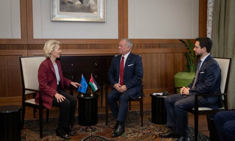 وأشار جلالته خلال لقائه مع رئيسة المفوضية الأوروبية، إلى أهمية إدامة التنسيق مع الاتحاد الأوروبي حيال المستجدات في المنطقة، بما يخدم المصالح المشتركة ويحقق الأمن والاستقرار.