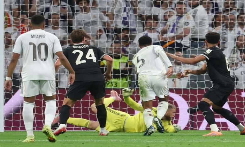لكنّ فارق الإمكانات الفردية ظهر أخيرا وتحديدا عبر نجمه البرازيل فينيسيوس الذي قام بمراوغة رائعة وانطلق داخل المنطقة قبل أن يسدد كرة دقيقة بقدمه اليسرى ارتطمت بالقائم، لكنّ بيلينغهام كان في المكان المناسب، وتابع الكرة في الشباك (57).