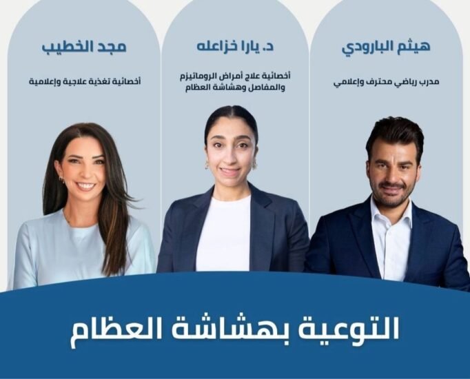 بمناسبة اليوم العالمي لهشاشة العظام، والذي يصادف في 20 تشرين الأول من كل عام، تنطلق، يوم السبت الموافق ٢٠٢٥/١٠/٢٥ حملة للتوعية بهشاشة العظام بمبادرة تنسيق من الدكتورة يارا خزاعله ( أخصائية علاج أمراض الروماتيزم والمفاصل وهشاشة العظام ) مع مجموعة من المختصين في مجالات التغذية و الصحة البدنية حيث تهدف هذه المبادرة التوعوية * إلى التعريف بمرض هشاشة العظام، والتوعية بأهمية الكشف المبكر، وطرق الوقاية والعلاج.