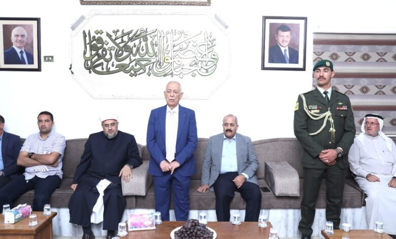 وفي محافظة إربد نقل العيسوي، خلال زيارته بيت عزاء المرحوم صهيب عبدالرحمن العكور، تعازي ومواساة جلالة الملك وسمو ولي العهد، إلى ذوي الفقيد وعموم عشيرة العكور، سائلا المولى عز وجل أن يتغمده بواسع رجمته.