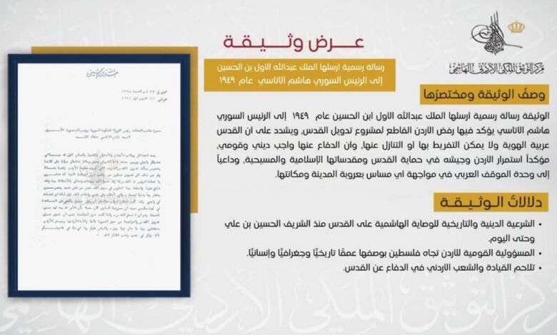 عرض مركز التوثيق الملكي الأردني الهاشمي، وثيقة تاريخية رسمية تؤكد الموقف الراسخ تجاه فلسطين والقدس الشريف، تعود إلى 19 تشرين الأول 1949، وتتضمن رسالة من جلالة المغفور له الملك عبدالله الأول، إلى الرئيس السوري هاشم الأتاسي.