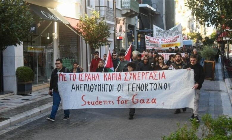 تظاهر متضامنون مع فلسطين في ميناء باترا اليوناني احتجاجا على سفينة تقل سياحا إسرائيليين كانت من المقرر أن ترسو في الميناء، قبل أن تغير مسارها نحو ميناء آخر.