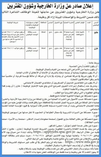 أعلنت وزارة الخارجية وشؤون المغتربين الأحد، عن حاجتها لتعبئة وظائف شاغرة ضمن الشروط والمواصفات المبينة ازاء كل وظيفة.تالياً التفاصيل: