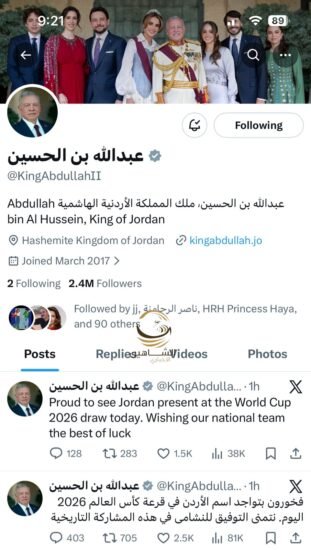 عبر جلالة الملك عبدالله الثاني، الجمعة، عن فخره بتواجد اسم الأردن في قرعة كأس العالم 2026 اليوم.