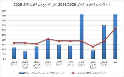 وأوضح آل خطاب، أن أداء الموسم المطري حتى تاريخه يظهر تحسنا لافتا في المناطق الجنوبية بما فيها الأغوار الجنوبية والعقبة، حيث تراوح الأداء بين 148 بالمئة و246 بالمئة من المعدل المفترض، في حين كان الأداء حول معدله في معظم مناطق المملكة الأخرى، باستثناء المناطق الوسطى الغربية التي ما زال أداؤها المطري ضعيفا بنسبة 48 بالمئة فقط.
