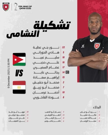 أعلن الاتحاد الأردني لكرة القدم، تشكيلة المنتخب الوطني في مباراته امام منتخب مصر ضمن منافسات بطولة كأس العرب 2025، المرتقبة عند الساعة الخامسة والنصف عصر اليوم الثلاثاء.وتاليا التشكيلة: