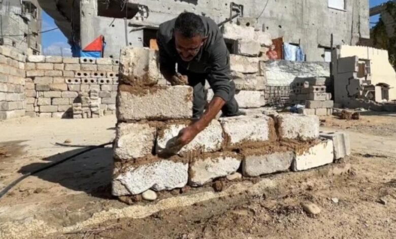 منذر شحادة، والذي قُصف بيته في مخيم جباليا شمالي القطاع، قبل إعلان وقف اطلاق النار بأيام، قام باستصلاح بعض الحجارة من ركام منزله وتنظيف ما يقارب 50 مترًا، ومن ثم بدأ بإعادة بنائه وفق الطريقة البدائية التي اعتمدها أجداده ابان النكبة الفلسطينية عام 1948.