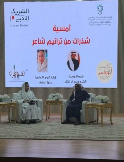 وقدّمت الأمسية الإعلامية سارة العفيف، التي أضفت بحضورها الإعلامي المتمكن طابعًا أنيقًا على مجريات اللقاء، وأسهمت في إدارة الحوار بسلاسة، ما أتاح للجمهور الاقتراب أكثر من تجربة الشاعر ورؤيته الأدبية.