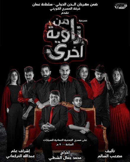 وعن عناصر المسرحية قال رئيس مجلس ادارة فرقة المسرح الكويتي الفنان احمد السلمان الى ان مسرحية – من زاوية اخري – من تاليف مصعب الساللم واخراج محمد جمال الشطي وبطولة كوكبة من نجوم فرقة المسرح الكويتي ومنهم حسن ابراهيم وهيا السعيد ومحمد الشطي ومصعب السالم وسعد العوض وماجد البلوشي وحوراء وايلاف ومحمد اشكناني .. ويضم الفريق الفني عبدالعزيز البكر مخرج كنترول وخلود الكندري مصممة الديكور وخالد السالم منفذ الديكور وتصميم الخدع وجاسم التميمي مخرج منفذ وتصميم الاضاءه وايمان السيف مصممة ازياء وانوار سعود مدققة لغوية ومساعد مخرج وابراهيم الجساسي تصميم المكياج وسعداوي تصميم البوستر وعبدالله الفارس مدير الخشبة .