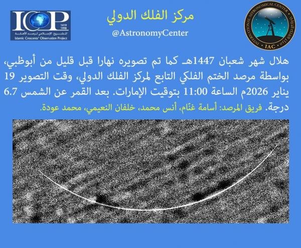 كشف مركز الفلك الدولي اليوم الإثنين، عن ظهور هلال شهر شعبان حيث تم تصويره من أبو ظبي صباحًا