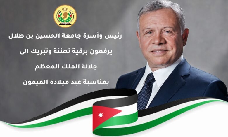 بمناسبة عيد ميلادكم الميمون الرابع والستين، يُسعدني ويُشرفني يا مولاي أن أرفع لمقامكم السامي باسمي واسم أسرة جامعة الحسين بن طلال، أسمى معاني الوفاء والتهنئة والتبريك بهذه المناسبة الغالية على قلوب الأردنيين كافة، ضارعين إلى الله العلي القدير أن يحفظكم ويرعاكم ويمدكم بعونه وتوفيقه وأن يمتعكم بموفور الصحة والعافية، أعاده الله عل جلالتكم بالخير واليُمن والبركة، معاهدين جلالتكم السير خلف قيادتكم في مسيرة الإصلاح والتقدم والتطوير.