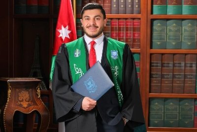 وحصوله على شهادة البكالوريوس في الحقوق، بتقدير جيد جداً، من جامعة عمّان الأهلية.
