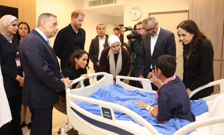 مدير عام الصحة العالمية والأميران هاري وميغان يزورون أطفال غزة بالمستشفى التخصصي