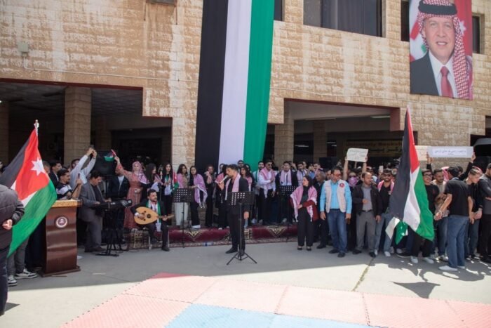 وشهدت الفعاليات ايضاً مشاركة مميزة من موسيقات الأمن العام، التي أضفت أجواءً وطنية حماسية، فيما ازدانت أروقة الجامعة بالأعلام الأردنية في لوحة جسدت وحدة الأردنيين وتلاحمهم، وعكست روح الانتماء الصادق للوطن.