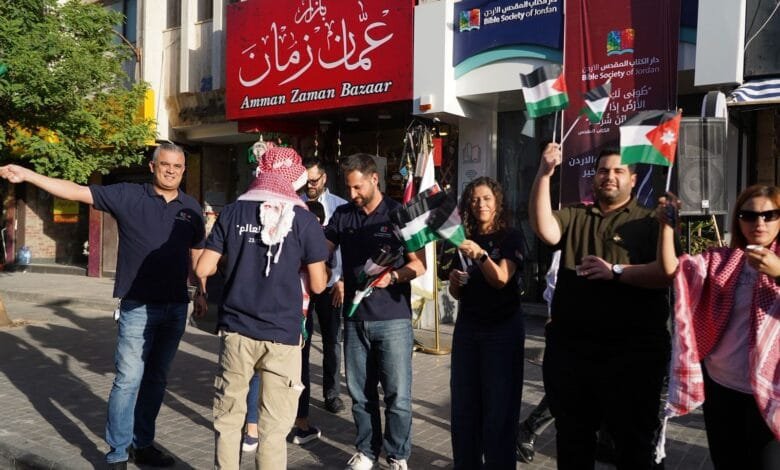 With a notable youth presence and strong patriotic enthusiasm, the Bible Society celebrated Jordan’s Independence Day on Sunday evening in front of its bookshop on Rainbow Street, Jabal Amman. The event will be followed by other celebrations in different areas, including Ghor Al-Safi, where wheelchairs will be distributed to a group of people with disabilities in the region.