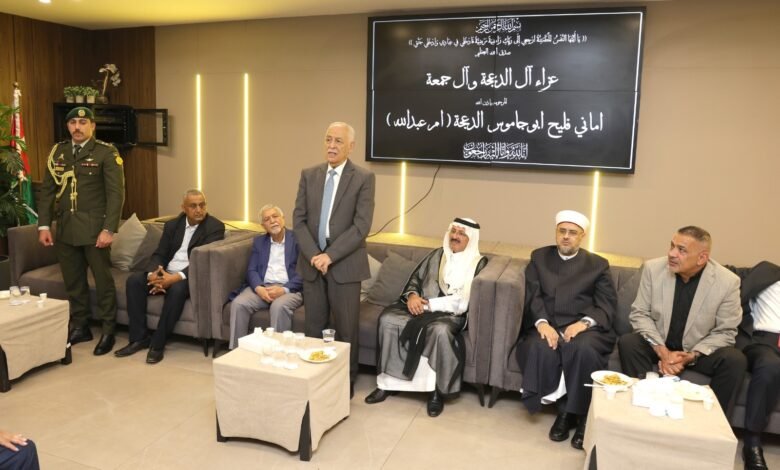 ونقل العيسوي، خلال زيارته بيت عزاء المرحومة أماني فليح عبدربه أبو جاموس الدعجة، زوجة مجاهد ماجد جمعة، في منطقة الرابية، تعازي ومواساة جلالة الملك وسمو ولي العهد، سائلا المولى عز وجل ان يتغمدها بواسع رحمته.